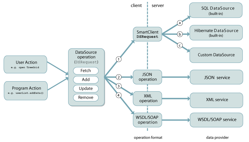 DataSources provide a data-provider agnostic API to Smart GWT Visual Components that allow them to perform the 4 CRUD operations (Create, Retrieve, Update, Delete). By "agnostic" we mean that the implementation details - the nuts and bolts of how a given DataSource actually retrieves or updates data - are unknown to bound Smart GWT components. One effect of this is that DataSources are "pluggable": they can be replaced without affecting the User Interface.